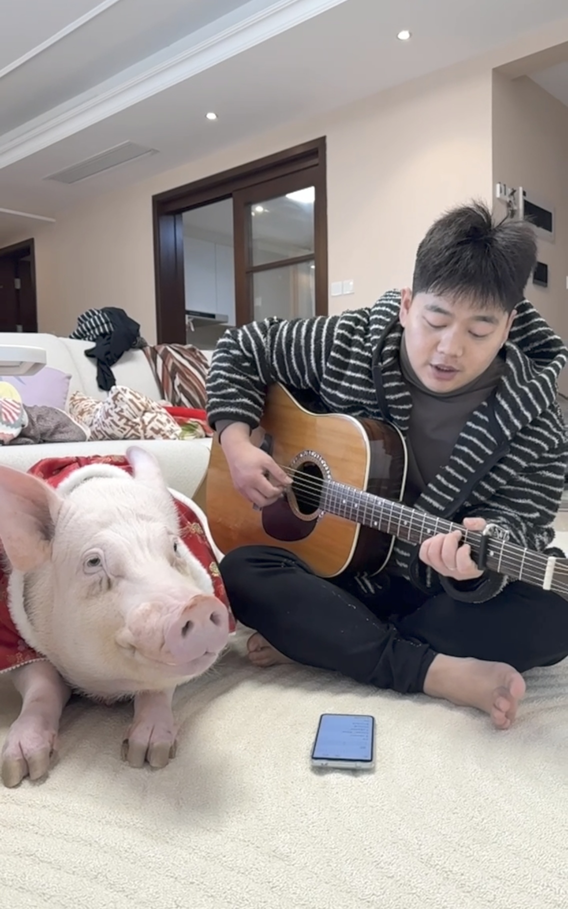 月月坦言,“猪蹄花”一个月的伙食费要上千元,但这份投入换来了满屋子的欢乐:男友弹吉他时,它会乖乖趴在腿边当“忠实听众”;主人回家,它会用软乎乎的猪鼻子蹭脸撒娇,哼唧声格外黏人;外出时从不会乱跑,慢悠悠跟在身后,情绪稳定得像个“小大人”;睡前不仅会配合刷牙洗脸,还会主动凑上前卖萌,求主人给它“挠痒痒”。